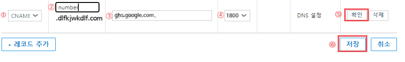 ① CNAME 선택, ② 오류에서 이름: 'numer' 입력, ③ 대상: ghs.google.com 입력 후 마지막에 "."을 꼭 추가 입력, ④ TTL 1800 설정, ⑤ 확인, ⑥ 저장