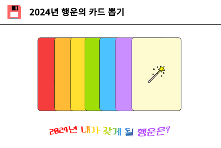2024년 행운의 카드 뽑기, 최신 유행 테스트 등 재미로 해보기 좋은 테스트 링크를 아래에 남겨 두니, 2024년 내가 갖게 될 행운이 무엇인지 알아보는 것도 재미있을 것 같습니다.