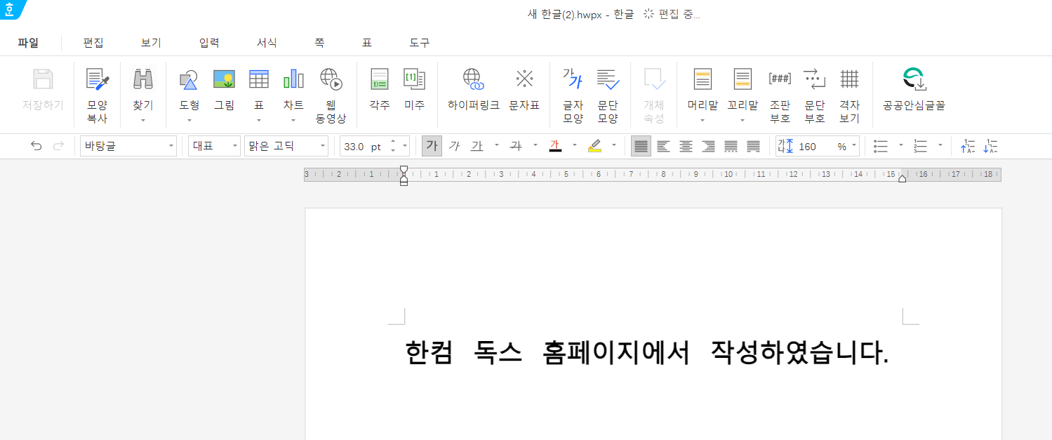 한글 새문서 만들기를 클릭하면, 아래와 같이 한글 편집 창이 위에 나타나며, 한글에서 사용하는 단축키도 사용 가능합니다.