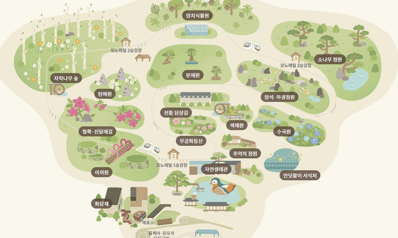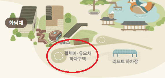 유모차나 휠체어 이용자는 메인 게이트 진입 후 비상등을 켜고 매표소 옆 회차 구역에서 하차 가능하며, 차량은 이동주차 하시면 됩니다. 장애인 주차장 이용 시 회차구역 바로 옆에 위치해 있습니다.