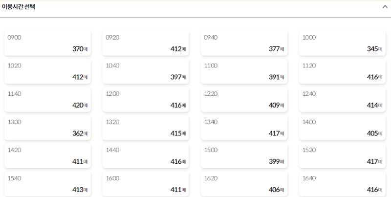 오전 9:00부터 20분 간격으로 이용시간을 선택할 수 있습니다. 1인당 1일 최대 50매까지 예매 가능하며, 실시간 잔여 티켓 수가 표시 됩니다.